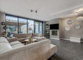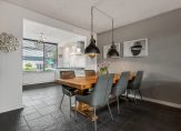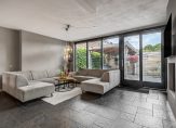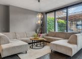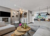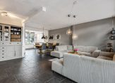 De uitgebouwde woonkamer aan de tuinzijde is heerlijk licht dankzij de kamerbrede achterpui met deur naar het terras. De gashaard in de strakke schouw zorgt voor extra sfeer. De vloer is afgewerkt met gemêleerde plavuizen en voorzien van comfortabele vloerverwarming. Wanden en plafonds zijn glad gestuukt.