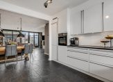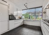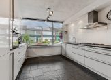 De begane grond is in 2007 volledig opnieuw ingedeeld en uitgebouwd, waardoor er een royale leefruimte is ontstaan. De moderne open keuken ligt aan de voorzijde en is ingericht in een praktische opstelling met hoogwaardige apparatuur. Aan de ene zijde vind je een grote koelkast, oven (vernieuwd in 2021) en veel bergruimte, aan de andere zijde een 6-pits gaskookplaat, RVS afzuigkap, spoelbak met heetwaterkraan (2024) en een vaatwasser. De zijdeglans witte fronten combineren fraai met het antracietkleurige natuurstenen werkblad.