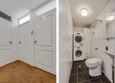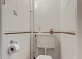 De voormalige badkamer is nu een was-/toiletruimte met aansluiting voor wasmachine en droger, een sanibroyeur toilet en een fonteintje.