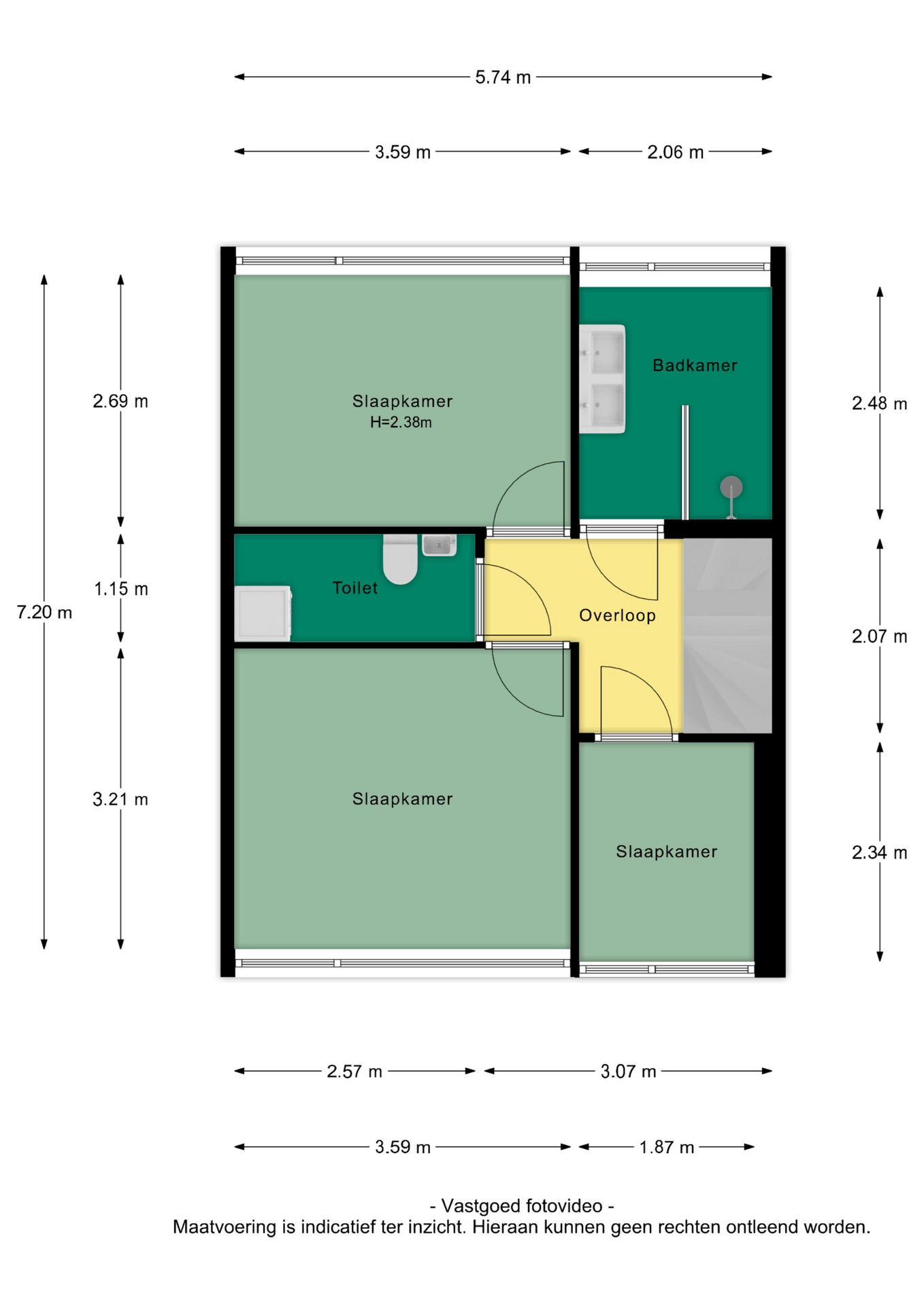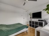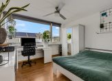 Via de overloop bereik je drie slaapkamers (ca. 12 m², 10 m² en 5 m²), voorzien van glad gestuukte wanden en elektrische rolluiken. De kleinste kamer is momenteel ingericht als praktische kastenkamer.