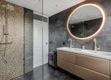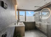 De badkamer is in oktober 2024 volledig vernieuwd en ademt luxe en stijl. Denk aan een royaal wastafelmeubel in warme bronskleur met dubbele wastafel, goudkleurige kranen, een ronde spiegel met verwarming en instelbare verlichting, een designradiator en een inloopdouche met ‘smoked glass’ scheidingswand en regen-/handdouche in goudkleurige uitvoering. De afwerking met antraciet-/bronskleurige tegels en mozaïekaccenten maakt het geheel tot een echte eyecatcher!