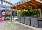 De achtertuin ligt gunstig op het zuidoosten en biedt veel privacy. De tuin is onderhoudsvriendelijk aangelegd met bestrating, een border, buitenkraan én een gezellige overkapping waar je tot in de late uurtjes buiten kunt zitten. Via de stenen berging (met elektra en verlichting) is het achtergelegen pad bereikbaar.