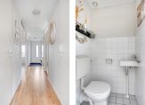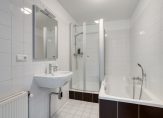 De toiletruimte is fris afgewerkt met witte wand- en vloertegels en voorzien van een toilet en fonteintje. De badkamer biedt volop comfort met een ligbad, douchecabine, wastafel, radiator en kastruimte. De witte tegels zorgen voor een verzorgde uitstraling, terwijl de donkerbruine accenten bij het bad en de douche voor een stijlvol contrast zorgen.