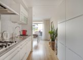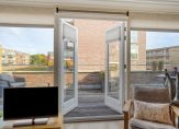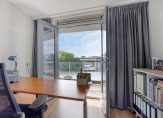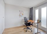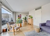 De woonkamer strekt zich uit over de volledige breedte van het appartement en wordt overspoeld door daglicht dankzij de kamerbrede pui en de ligging op het zuidoosten. Via de openslaande deuren stap je zo het ruime dakterras op.