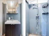 De badkamer is zowel vanuit de keuken als vanuit de grootste slaapkamer bereikbaar en is ingericht met een wastafelmeubel en een inloopdouche. In de badkamer ligt nog de originele granitovloer.