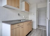 De keuken is voorzien van een eenvoudig keukenblok met houtstructuur fronten en een RVS-aanrechtblad met spoelbak. In een nis naast de balkondeur staat de ATAG HR-cv-combi ketel uit 2013 opgesteld.