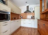 De gedeeltelijk open keuken is voorzien van een L-vormige inbouwkeuken met gebroken witte fronten en een kunststof aanrechtblad in een houtstructuur. U heeft hier de beschikking over een losse combimagnetron, vaatwasser, spoelbak, keramische kookplaat, schouwwasemkap, koelkast en vriesladen.