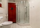 De toiletruimte is voorzien van een toilet en een fonteintje; de wanden in deze ruimte zijn betegeld met wit gemarmerde resp. zwarte tegels en op de vloer liggen witte tegels. De badkamer is voorzien van een wastafel, een handdoekenradiator en een douchecabine; de wanden in deze ruimte zijn volledig betegeld met wit gemarmerde tegels en op de vloer liggen witte tegels.