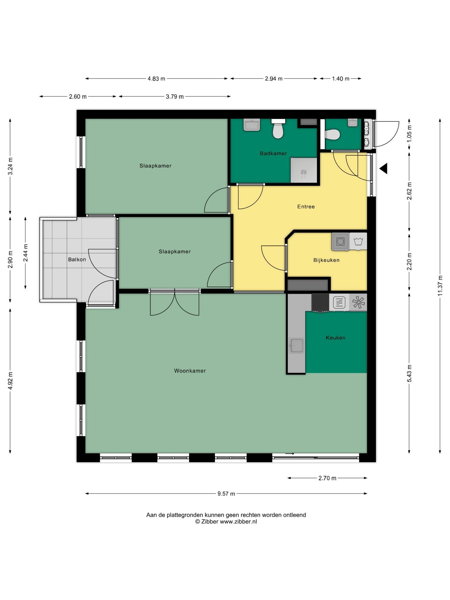 Dit oppervlakte kan worden vergroot tot 60m2, indien de 2e slaapkamer bij de woonkamer gaat betrekken en als werkkamer gaat gebruiken.