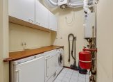De inpandige berging is voorzien van een werkblad met daaronder de aansluitingen voor de wasmachine en droger. Boven het werkblad hangen een aantal praktische opbergkastjes. Ook staan in deze ruimte de HR-cv-combi ketel (Nefit Proline NxT HRC 24/CW4, geplaatst in december 2019) en de mechanische ventilatie-unit opgesteld. De wanden zijn voorzien van een gladde, sausbare afwerking en op de vloer liggen witte gemarmerde plavuizen.