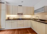 De gedeeltelijk open keuken is voorzien van een deur naar het buitenterras (inclusief hordeur) en een keurige L-vormige inbouwkeuken met vanillekleurige fronten en een antraciet/zwart gemêleerd granieten aanrechtblad. U heeft hier de beschikking over een koelkast met vriesvak (Miele, nieuw geplaatst in 2023), een inductiekookplaat, vlakschermafzuigkap, carrouselkast, spoelbak en een vaatwasser.