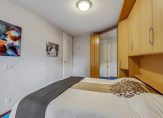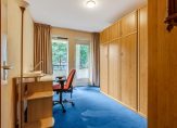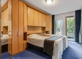 Het appartement beschikt over twee comfortabele slaapkamers. De grootste kamer (ca. 14 m²) is ruim van opzet en voorzien van een royale, losse kastenwand. Vanuit deze slaapkamer stapt u via een deur met hordeur zo het zonnige buitenterras op. Ook de tweede slaapkamer annex werkkamer (ca. 10 m²) biedt toegang tot het terras. Deze kamer is slim ingericht met een grote kastenwand waarin een uitklapbaar bed van 1,20 meter breed is geïntegreerd; een ruimtebesparende én logeervriendelijke oplossing. De sfeervolle glas-in-looddetails in de binnendeur en het bovenlicht geven de kamer extra karakter.
