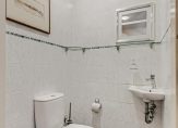 De toiletruimte is voorzien van een toilet en een fonteintje; de wanden zijn geheel betegeld met witte gemarmerde tegels met een decorrand en op de vloer liggen blauwe tegels.