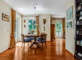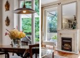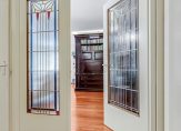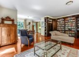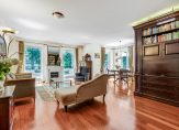 Via dubbele deuren met glas-in-lood komt u in de woonkamer en wat een fijne ruimte treft u daar! De plafondhoge ramen in combinatie met de situering op het zuiden en westen zorgen voor een hele prettige lichtinval. Vanuit de woonkamer heeft u toegang tot het terras, en de aanwezigheid van een schouw met elektrische haard draagt bij aan de warme sfeer. Een grote, authentieke boekenkast vormt een echte blikvanger: ideaal voor uw boekencollectie, maar ook verrassend praktisch dankzij de slimme opbergruimte voor bijvoorbeeld een schildersezel of creatieve materialen.