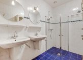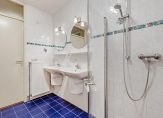 De badkamer is in dezelfde kleurstelling betegeld en is voorzien van een dubbele wastafel (beiden met planchet en spiegel), een radiator, een douchehoek met 2 glazen deuren en 2 losse hoge kasten.