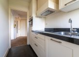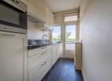 De keuken is voorzien van een deur naar het balkon (inclusief rolhordeur) en een complete inbouwkeuken met gebroken witte fronten en een antracietkleurig gemêleerd composiet aanrechtblad. Je hebt hier de beschikking over een combimagnetron, koelkast met vriesvak, keramische kookplaat, schouwwasemkap, spoelbak, vaatwasser en een elektrische boiler (60 liter).