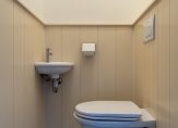 Vanuit de hal heb je toegang tot de toiletruimte, slaapkamer, keuken en woonkamer. De toiletruimte is voorzien van een wandcloset en een fonteintje; in deze ruimte zijn de wanden tot halverwege afgewerkt met een houten lambrisering met een hoge plint en op de vloer liggen antracietkleurige tegels.