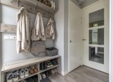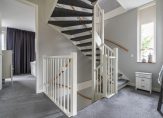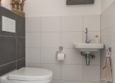 Bij binnenkomst in de L-vormige entreehal word je verwelkomd door een verzorgde uitstraling met strak gestuukte wanden en hoge witte plinten. Hier vind je de trapopgang, de meterkast en een keurig afgewerkte toiletruimte. Deze is voorzien van een wandcloset, fonteintje, een plafond met inbouwspots en een stijlvolle combinatie van witte en antracietkleurige tegels.