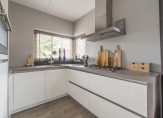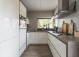 De straatgerichte woonkeuken (ca. 25m2) is een echte blikvanger, met genoeg plek voor een ruime eettafel. De U-vormige keuken heeft hoogglans witte fronten en een warm houtlook kunststof aanrechtblad en is heel compleet met moderne apparatuur: een koelkast, 3 vriesladen, een vaatwasser op hoogte, combioven, carrouselkast, kokend waterkraan, 5-pits gaskookplaat en RVS afzuigkap. Dankzij het hoekraam heb je tijdens het koken een weids uitzicht in alle richtingen, terwijl de drie grote ramen bij de eethoek voor nog meer daglicht en een fijne, lichte sfeer zorgen.