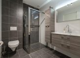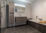 De complete badkamer is modern en verzorgd afgewerkt met witte wandtegels tot aan het plafond en antracietkleurige tegels op de vloer en tegen de linkerwand. Je hebt hier de beschikking over een ligbad, een wastafelmeubel, wandmeubel, een ruime douche met regen- en handdouche en een glazen wand en schuifdeur, een wandcloset en een handdoekenradiator.