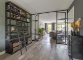 Via een fraaie stalen pui met openslaande deuren kom je in de royale woonkamer (ca. 35m2), die zowel via de openslaande dubbele deuren als via een separate deur direct toegang geeft tot de tuin. De gashaard voegt een sfeervol accent toe, terwijl een praktische trap-/provisiekast extra opbergruimte biedt. De hele begane grond is afgewerkt met een strakke PVC-vloer met vloerverwarming en lichte wanden met hoge plinten, wat zorgt voor een warme en comfortabele leefomgeving.