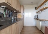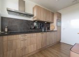 De keuken beschikt over een nette inbouwopstelling met houtstructuur fronten en een bronskleurig kunststof werkblad. Je vindt hier alles wat je nodig hebt: een inductiekookplaat, schouwwasemkap, vaatwasser, spoelbak, koelkast en combimagnetron.