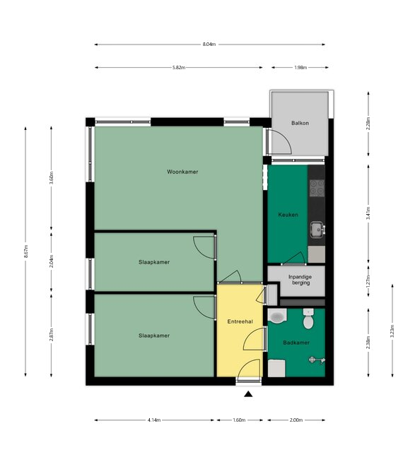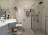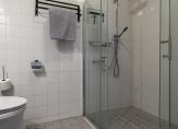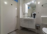 Via de entreehal met meterkast krijg je toegang tot de badkamer, de eerste slaapkamer en de woonkamer. De badkamer is netjes afgewerkt met witte wandtegels en een gemêleerde grijze vloertegel, en is voorzien van een wastafelmeubel met spiegel, een toilet, douche en aansluiting voor de wasmachine.