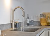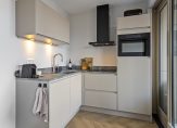 De L-vormige keuken is stijlvol en modern, met taupekleurige fronten en een grijs gemêleerd kunststof werkblad. Aan alles is gedacht: een vaatwasser, spoelbak met Quooker, inductiekookplaat, afzuigkap, koelkast en combi-oven maken koken hier moeiteloos én plezierig. Of je nu snel iets klaarmaakt of uitgebreid wilt koken voor vrienden: deze keuken is er helemaal klaar voor!