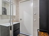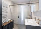 De badkamer sluit qua stijl perfect aan en is net zo smaakvol afgewerkt. Je vindt hier een zwart wastafelmeubel met bijpassende spiegelkast, een wandkast, een handdoekenradiator en een royale inloopdouche met glazen schuifwand; een fijne plek om je dag fris te beginnen of ontspannen af te sluiten.