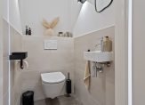 De toiletruimte is stijlvol ingericht met een wandcloset en een fonteintje. De zandkleurige wandtegels in combinatie met de taupekleurige vloertegels geven deze ruimte een rustige, luxe uitstraling.