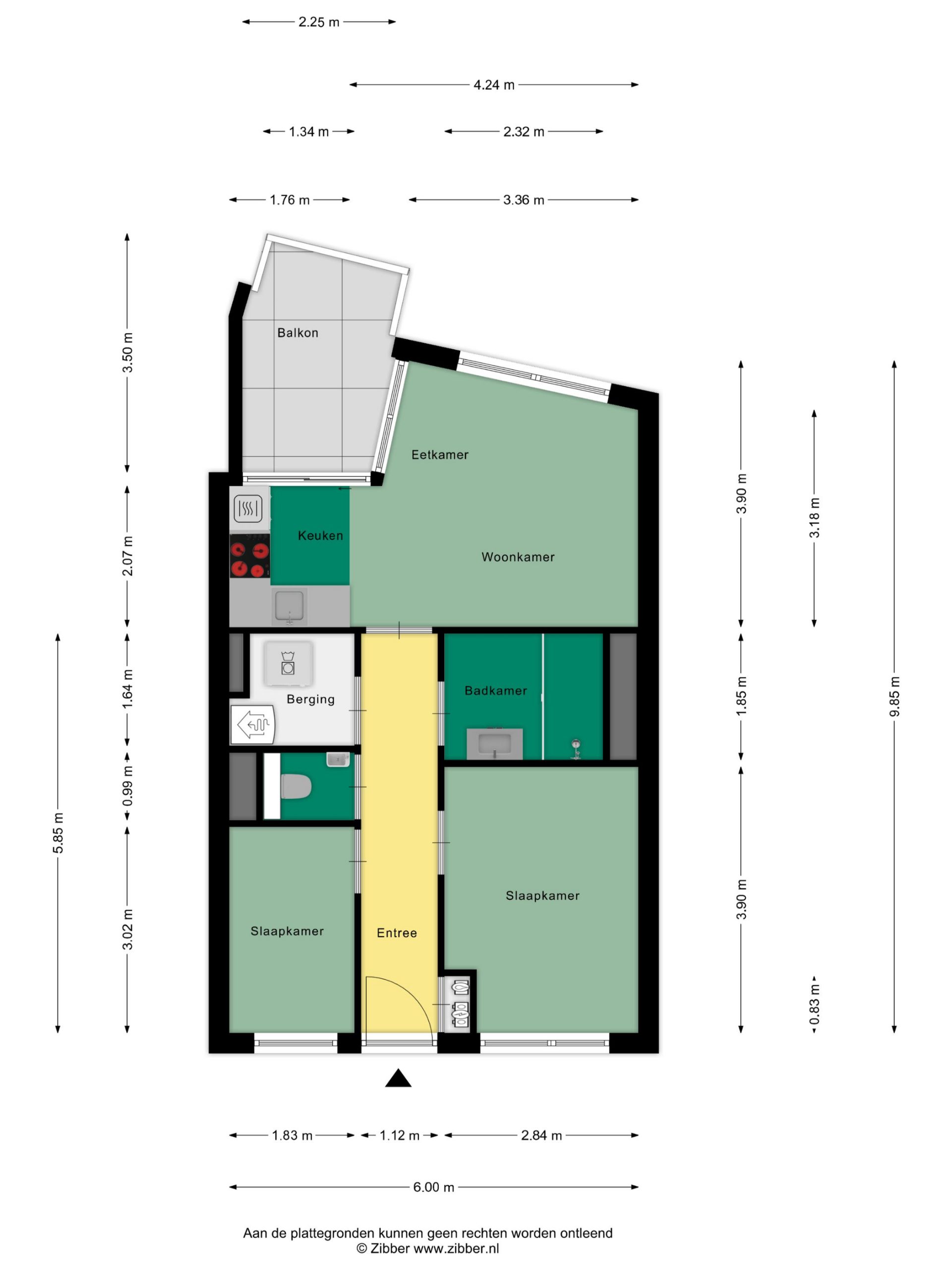 Je stapt binnen in een ruime en nette entreehal, die direct toegang geeft tot alle vertrekken: de meterkast, twee slaapkamers, het toilet, de badkamer, een praktische inpandige berging en de lichte woonkamer met open keuken.