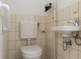 In de hal hangt de intercom en vanuit de hal krijg je toegang tot de toiletruimte, de keuken en de woonkamer. De toiletruimte is voorzien van een toilet en een fonteintje; hier zijn de wanden betegeld met vanillekleurige wandtegels en liggen er op de vloer dezelfde grijze tegeltjes als in de badkamer.