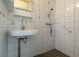 De slaapkamer is met 12m2 prettig ruim en geeft toegang tot de badkamer. Deze is voorzien van een wastafel met planchet en spiegel en een douche. De wanden zijn betegeld met witte tegels en op de vloer liggen grijze tegeltjes.