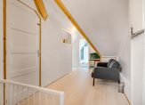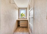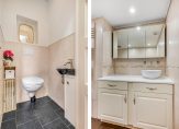 Via een schuifdeur kom je in het achterportaal met lichtkoepel, designradiator, kastenwand en toiletruimte. Achter de schuifpanelen van de kastenwand vind je de aansluitingen voor de wasmachine en droger én extra bergruimte. De toiletruimte is voorzien van een wandcloset en fonteintje en betegeld met cameekleurige wandtegels en antracietkleurige plavuizen.