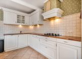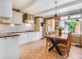 In de lichte woonkeuken (ca. 15m²) heb je ruimte voor een royale eettafel. De landelijke keuken heeft een L-vormige opstelling met crèmekleurige fronten en een houtstructuur kunststof aanrechtblad. Je hebt hier de beschikking over een vaatwasser, spoelbak, carrouselkast, 5-pits gaskookplaat, afzuigschouw, koelkast en magnetron.