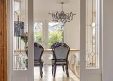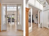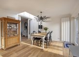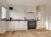 Vanuit de hal krijg je toegang tot de woonkamer. De woonkamer heeft een oppervlakte van 23m2 en heeft door de grote ramen in voor- en zijgevel een prettige lichtinval. In 2009 is de woning aan de achterzijde uitgebouwd, waardoor er een mooie woonkeuken van 19m2 is ontstaan. Deze wordt van de woonkamer gescheiden door sfeervolle lood-op-glas schuifdeuren. Door de fraaie lichtstraat en de openslaande tuindeuren is ook de woonkeuken een ruimte die zich kenmerkt door de fijne lichtinval. De woonkeuken is voorzien van een extra tuindeur, een airco-unit, een designradiator en een complete inbouwkeuken met gebroken witte fronten en een zwart composiet aanrechtblad. Je hebt hier de beschikking over een vaatwasser (Miele), spoelbak, koelkast (Miele), schouwafzuigkap en een Boretti-fornuis met een 6-pits gaskookplaat en een grote elektrische heteluchtoven. Vanuit de keuken is de praktische bijkeuken bereikbaar, waar je de aansluitingen voor de wasmachine en droger vindt.
