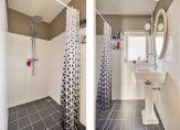 Aan de overloop grenzen 3 slaapkamers en de badkamer. De grootste slaapkamer (12m2) is voorzien van een airco-unit en een vaste kast. De middelste slaapkamer (10m2) is eveneens uitgerust met een vaste kast en de kleinste slaapkamer (5m2) heeft een deur naar de uitbouw. De badkamer is voorzien van een wastafel en een inloopdouche en is betegeld met witte wandtegels en zwarte vloertegels.