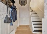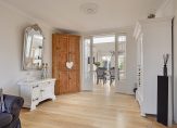 De entreehal, de woonkamer en de woonkeuken zijn voorzien van een lichte eiken lamelparketvloer. In de toiletruimte ligt een granitovloer en in de bijkeuken een zwarte plavuizenvloer.