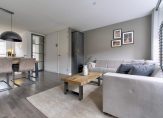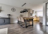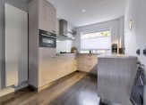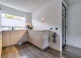 De sfeervolle en tuingerichte woonkamer is voorzien van trapkast en een deur naar de tuin. In de gedeeltelijk open keuken is een U-vormige inbouwkeuken geplaatst, waarbij het brons/antracietgekleurde aanrechtblad fraai afsteekt bij de greywash walnootstructuur fronten. Deze complete inbouwkeuken is uitgerust met een combimagnetron, koelkast, 5-pits gas-op-glas-kookplaat, schouwafzuigkap (RVS), vaatwasser en een 1¼ spoelbak.
