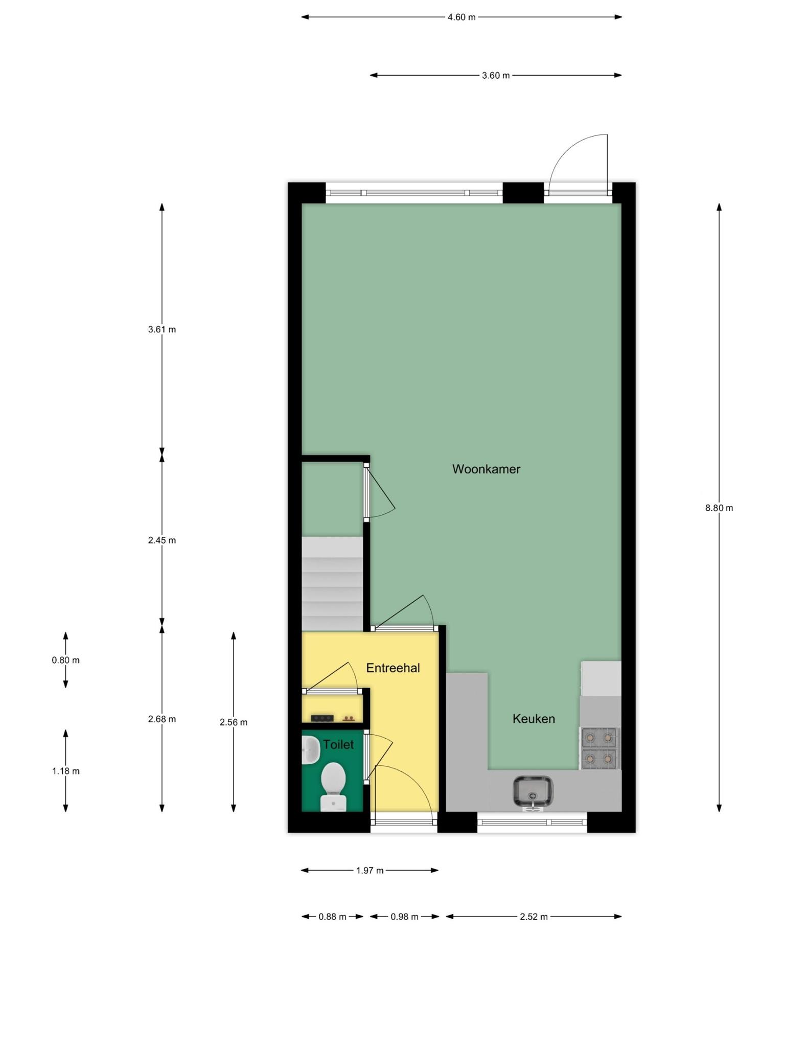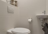 In de entreehal vind je de meterkast, trapopgang en de toiletruimte. De toiletruimte is voorzien van een wandcloset en een fonteintje; de wanden zijn geheel betegeld met witte wandtegels en op de vloer liggen antracietkleurige plavuizen.