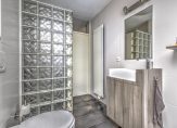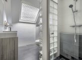 De nette en tijdloos ingerichte badkamer is voorzien van een designradiator, wastafelmeubel, een op maat gemaakt wandmeubel, wandcloset, douche met glazen deur, en een kunststof dakraam. Ook is er een aansluiting ten behoeve van een ligbad aanwezig. De badkamer is betegeld met witte wandtegels; de vloer en 1 wand in de douche (gedeeltelijk) zijn betegeld met antracietkleurige plavuizen.