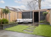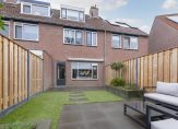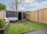 De fraai aangelegde achtertuin is gesitueerd op het oosten en is in 2019 nieuw aangelegd. Daarbij zijn er met grote grijze tegels een tweetal terrassen gecreëerd, zodat er op zonnige dagen altijd wel een plekje in zon of schaduw te vinden is. Op het terras bij de achtergevel kun je zon en schaduw doseren met behulp van de buitenzonwering. De terrassen worden van elkaar gescheiden door kunstgras, dat samen met de twee verhoogde plantenborders een mooie groene uitstraling aan deze fraaie tuin geeft. Achterin de tuin staat een praktische stenen berging. Zelfs de berging is een echte eyecatcher, want de voorzijde is bekleed met gepotdekselde Douglas-planken, die doorgetrokken zijn over de gehele breedte van de tuin. Hierdoor is naast de berging een praktische overkapping gecreëerd, waar je de beschikking hebt over een buitenkraan, stopcontacten en 2 afsluitbare poortdeuren naar het achtergelegen parkeerterrein.