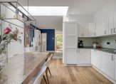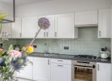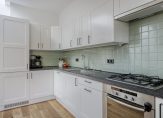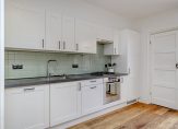 De woning is in 2014 aan de achterzijde uitgebouwd, waardoor er een royale woonkeuken is ontstaan met een grote lichtstraat, openslaande deuren naar de tuin en een L-vormige inbouwkeuken. Deze is voorzien van witte fronten en een granitolook kunststof aanrechtblad. Je hebt hier de beschikking over een koel-/vriescombinatie, vaatwasser, spoelbak, gaskookplaat en vlakschermafzuigkap. In de hoge kast rechts staat de HR-cv-combiketel (Intergas Kombi Kompakt HRE 28/24A uit november 2019) opgesteld.