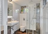 Vanuit de keuken is de moderne en volledig betegelde badkamer te bereiken. De wanden zijn grotendeels afgewerkt met witte wandtegels en de vloer is voorzien van bruin gemêleerde plavuizen. Deze kleurstelling komt heel speels ook weer terug in de wandbetegeling, waardoor er een nette en tijdloze basis is gecreëerd. In de badkamer beschik je over een douche met glazen scheidingswand- en deur, een 2e toilet, een wastafel, een wandmeubel en een handdoekenradiator.