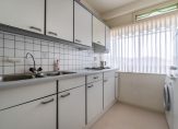 De keuken is voorzien van een aansluiting voor de wasmachine en ook de cv-combiketel (merk: Nefit / type: Economy VR / bouwjaar: ca. 2006) staat hier opgesteld. Verder is er een nette inbouwkeuken aanwezig in witte kleurstelling met grijze accenten en een grijs kunststof aanrechtblad. Je hebt hier de beschikking over een dubbele spoelbak, 4-pits gaskookplaat en een wasemkap.