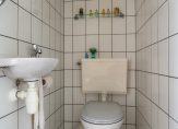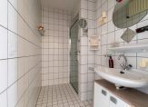 De badkamer en toiletruimte zijn beiden geheel betegeld, waarbij de wanden en de vloeren zijn voorzien van een witte tegels. De toiletruimte is voorzien van een toilet en een fonteintje en in de badkamer heb je de beschikking over een wastafel en een douchehoek met glazen deur.