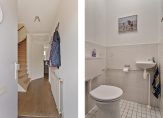 Je komt de woning binnen in de entreehal; deze is voorzien van een toiletruimte, meterkast en trapopgang. De toiletruimte is voorzien van een toilet en een fonteintje; de wanden zijn deels afgewerkt met lichte wandtegels en deels met spuitwerk. Op de vloer liggen witte tegeltjes.