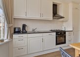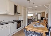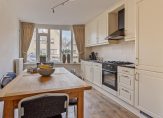 Vanuit de hal loop je de tuingerichte woonkamer in. Deze is voorzien van een praktische trapkast en een deur naar de tuin. Het grote raam zorgt in combinatie met de situering op het zuidoosten voor een heerlijk lichte woonkamer. De woonkamer staat in een gedeeltelijk open verbinding met gezellige eetkeuken, die is voorzien van een erker en een keurige inbouwkeuken. Ook hier geniet je van een fijne lichtinval. De keuken heeft roomkleurige fronten en een zwart gemêleerd granieten aanrechtblad en je hebt hier de beschikking over een koelkast, 3 vriesladen, elektrische heteluchtoven, gaskookplaat, schouwafzuigkap en een vaatwasser.
