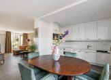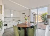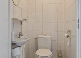 Vanuit de hal krijg je toegang tot de prettig lichte woonkamer, die in 2020 is gemoderniseerd. Er is toen vloerverwarming aangelegd, de wanden zijn glad gestuukt, afgewerkt met renovlies en hoge witte plinten en er zijn stijlvolle binnendeuren met een horizontale groef geplaatst. De plavuizenvloer met de uitstraling van een houten vloer vormt hier een sfeervolle basis. Je hebt er alle ruimte voor een royale zithoek en aan de tuinzijde kun je een mooi formaat eettafel kwijt. De woonkamer is voorzien van een schuifpui naar de tuin, een praktische trap-/voorraadkast en een deur naar het tussenportaal waar je de trapopgang en de toiletruimte vindt. De toiletruimte is voorzien van een toilet en een fonteintje met planchet en spiegel.