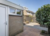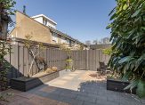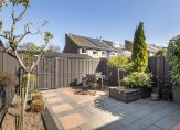 De achtertuin is leuk aangelegd en grotendeels voorzien van sierbestrating, waardoor je meerdere zitjes  kunt creëren en op zonnige dagen kunt kiezen of je in de zon of schaduw wilt zitten. Voor een groene uitstraling zorgen de 2 rechthoekige composiet plantenbakken en de border met diverse soorten beplanting. De tuin is rondom voorzien van een composiet schutting met een poortdeur en ook is er een buitenkraan aanwezig.